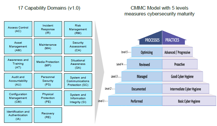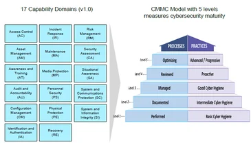 The CMMC levels, descriptions, and 17 capability domains are illustrated below. This image is from the CMMC public briefing available on the OSD CMMC web site.